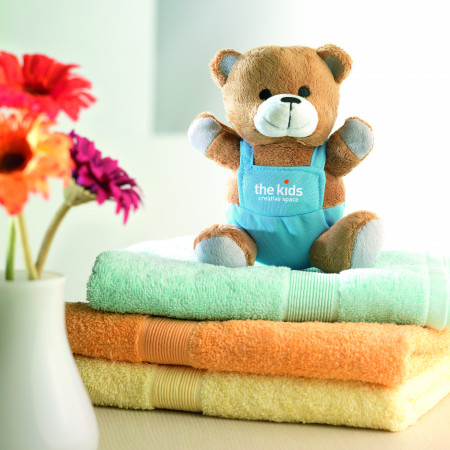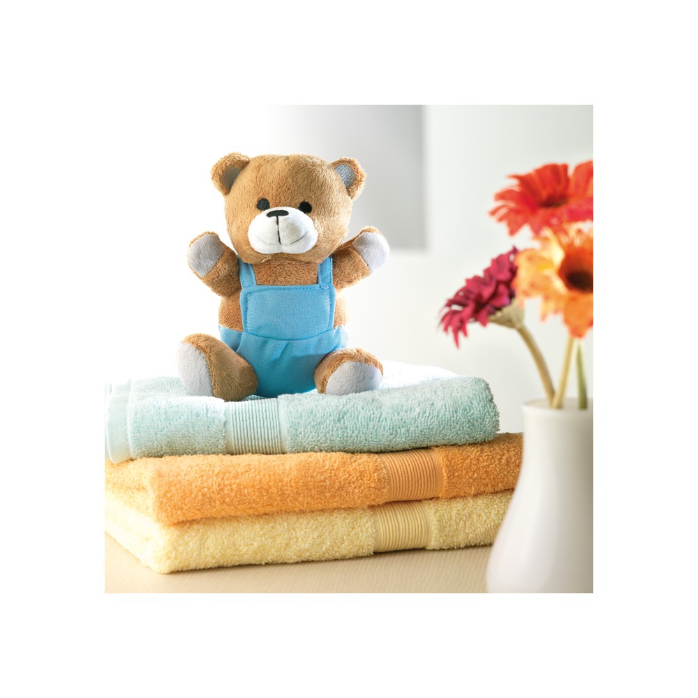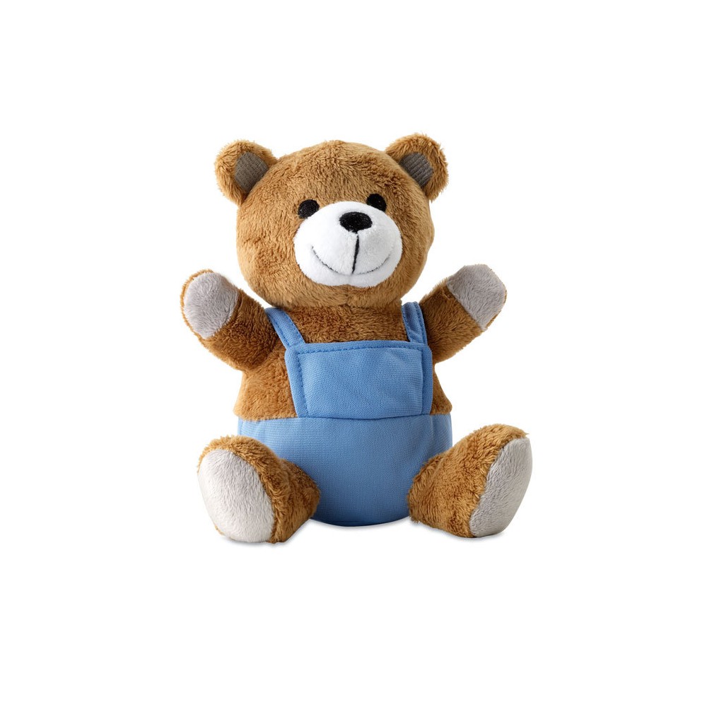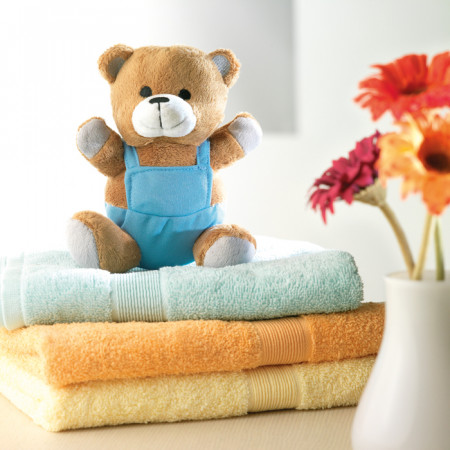 Miś pluszowy w kolorowym ubranku.