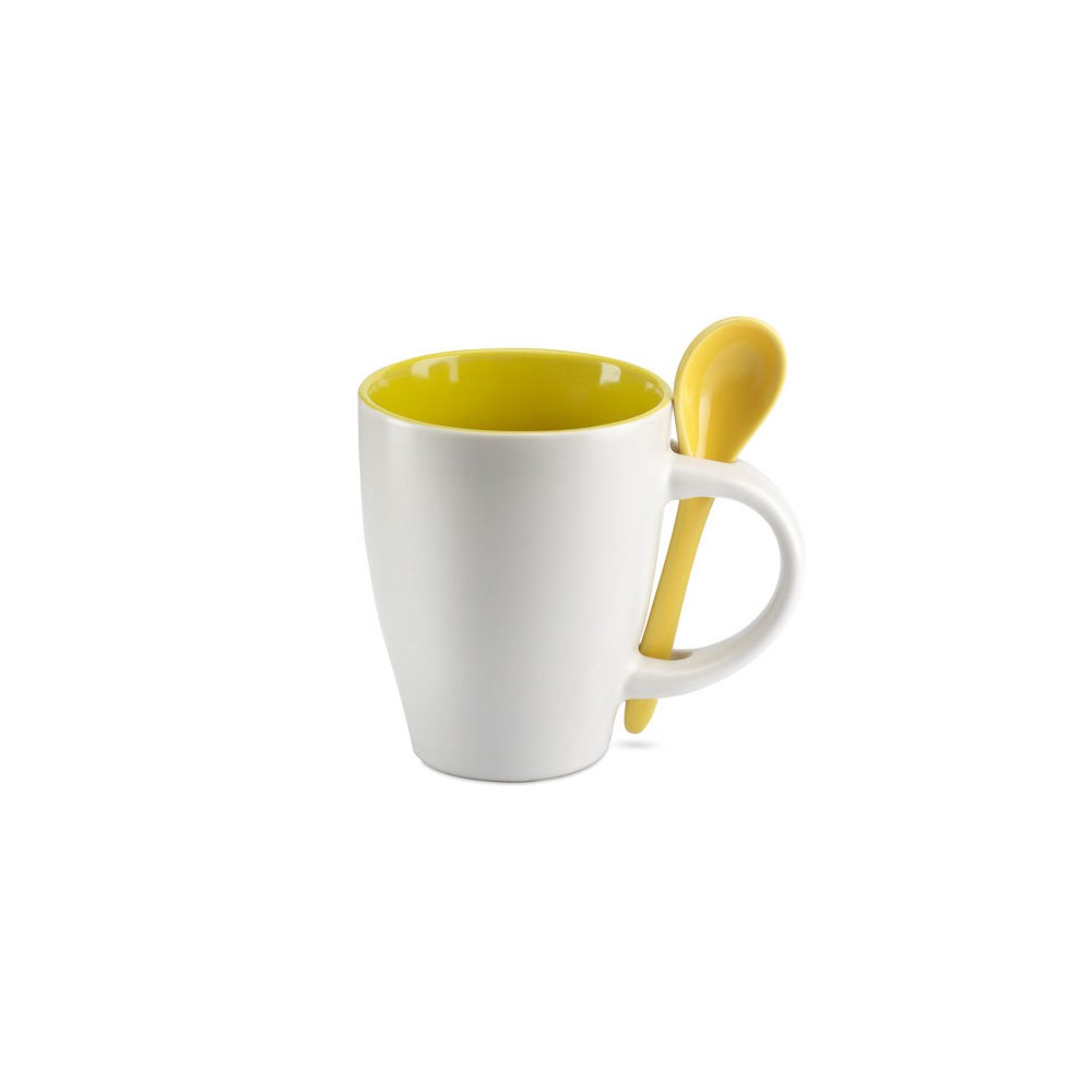 Dwukolorowy ceramiczny kubek do kawy z łyżeczką w kolorze wnętrza kubka. Poj. 250 ml. W pudełku 11,5x10,5x9,3cm. Tampodruk nie jest odporny na działanie zmywarki. Transfer na ceramice: odporny na działanie zmywarki.