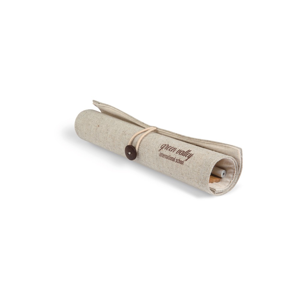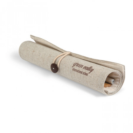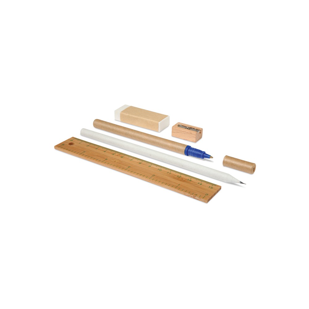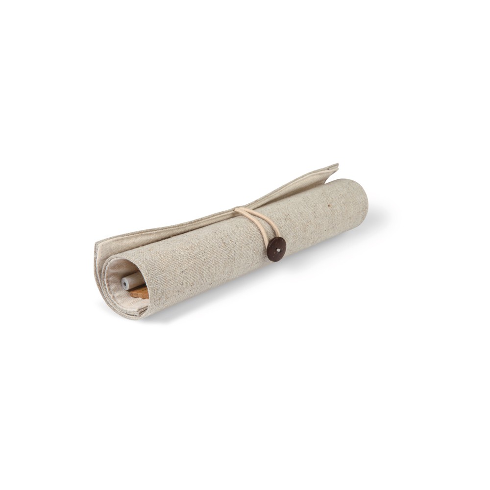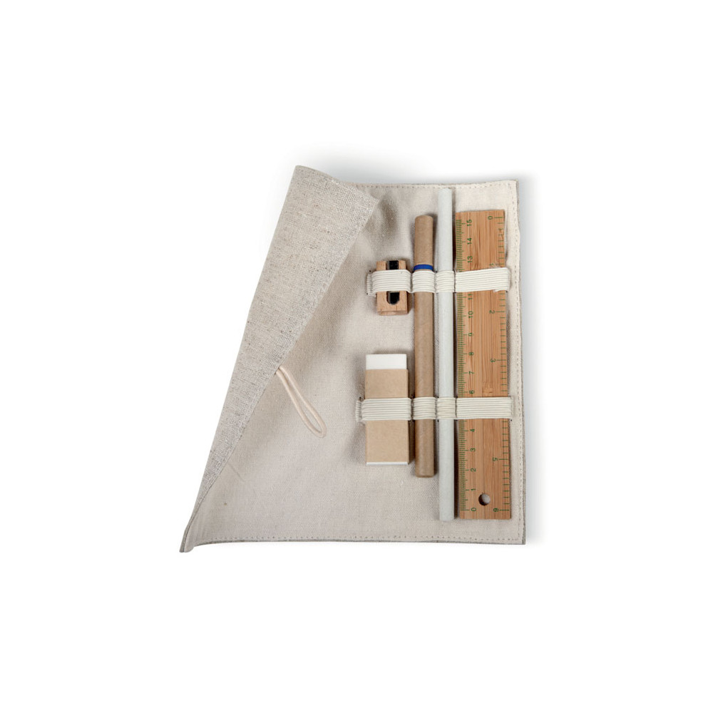 Zestaw biurkowy w etui wykonanym z juty i bawełny. W komplecie bambusowa linijka 15cm, papierowy ołówek, kartonowy długopis z niebieskim wkładem, drewniana temperówka i gumka.