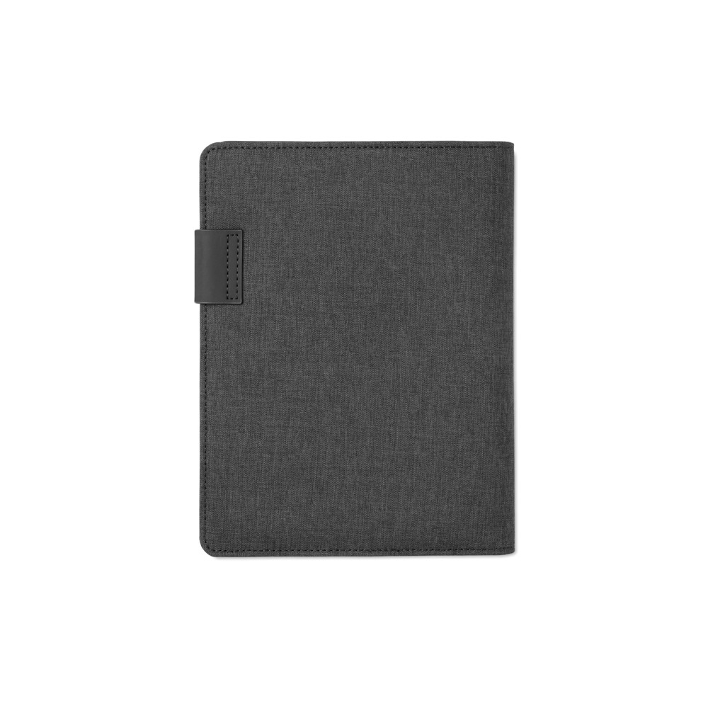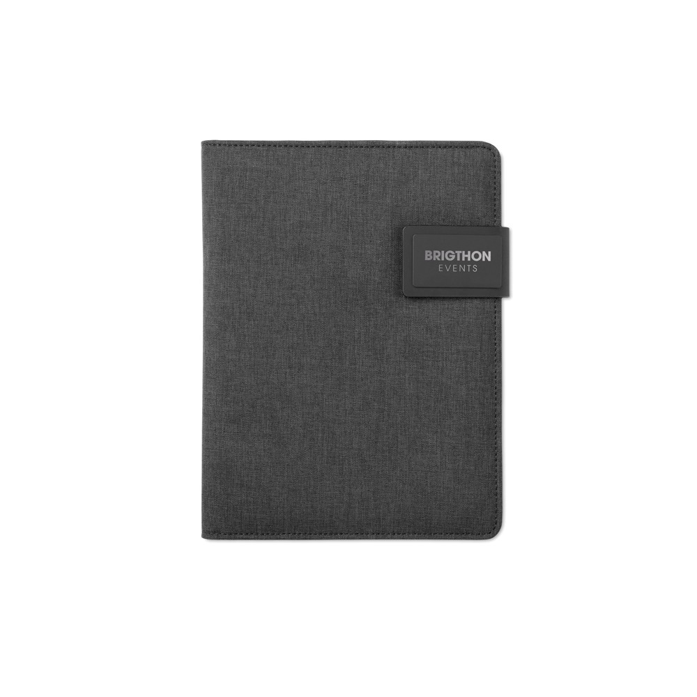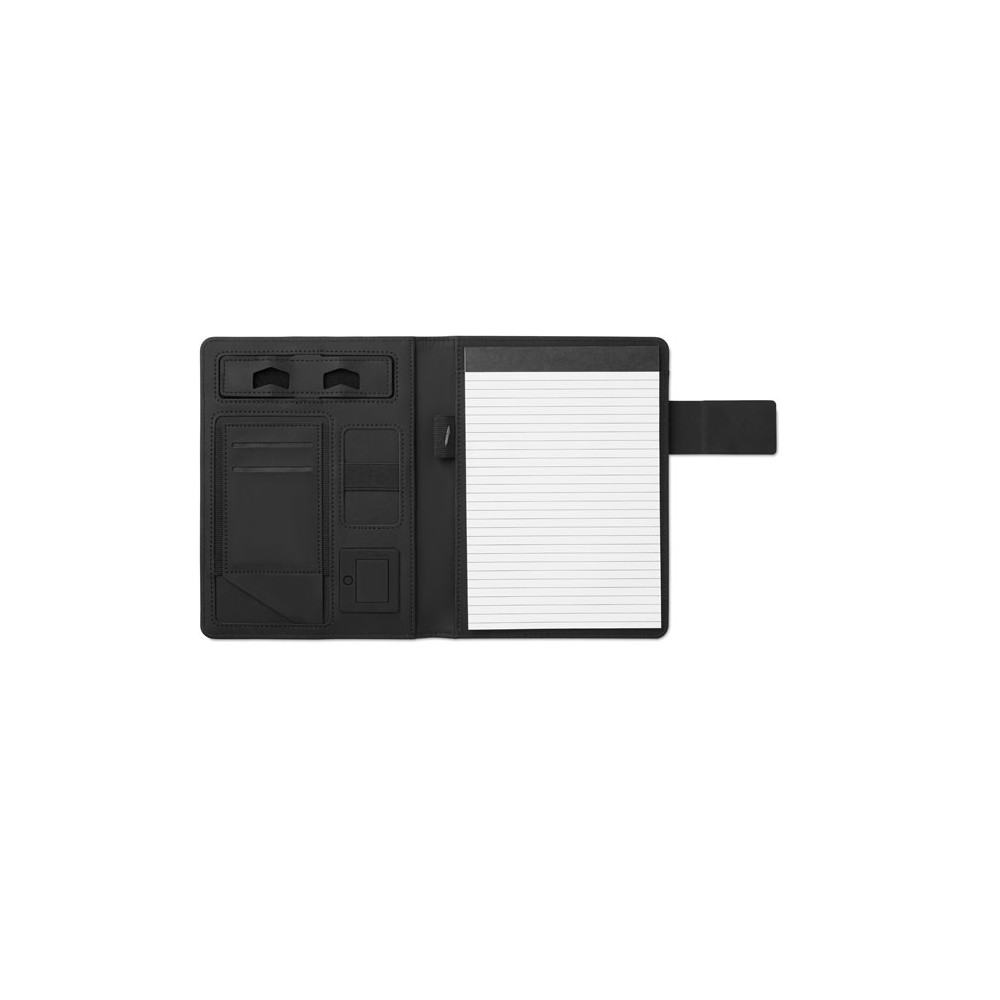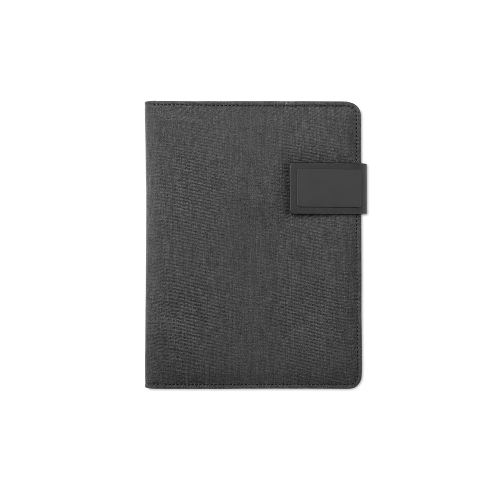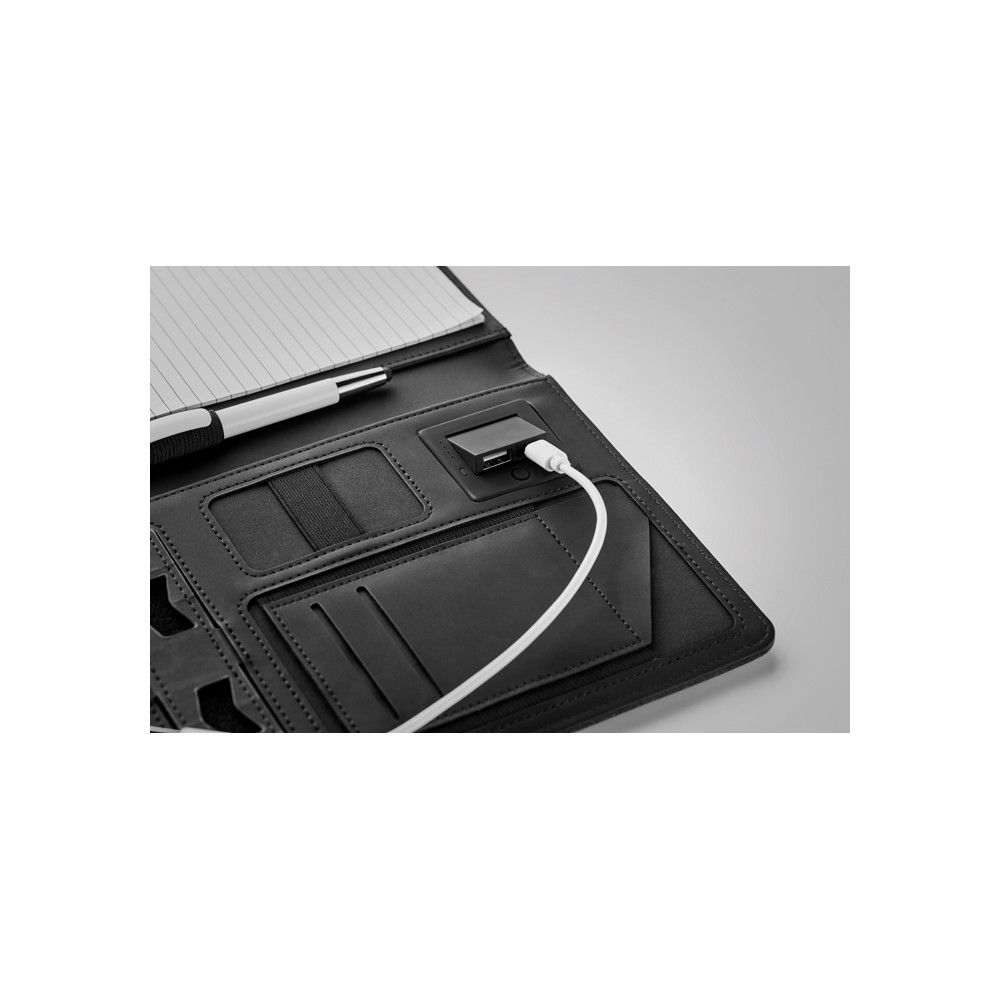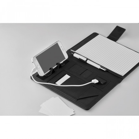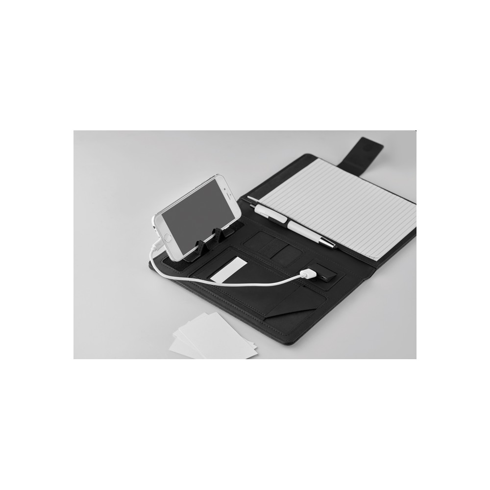 Teczka A5 z PU z magnetycznym zamknięciem i powerbankiem 4000mAh. Posiada wbudowane złącze micro USB -typ C . Zawiera notatnik 20stron i kilka wewnętrznych kieszeni.