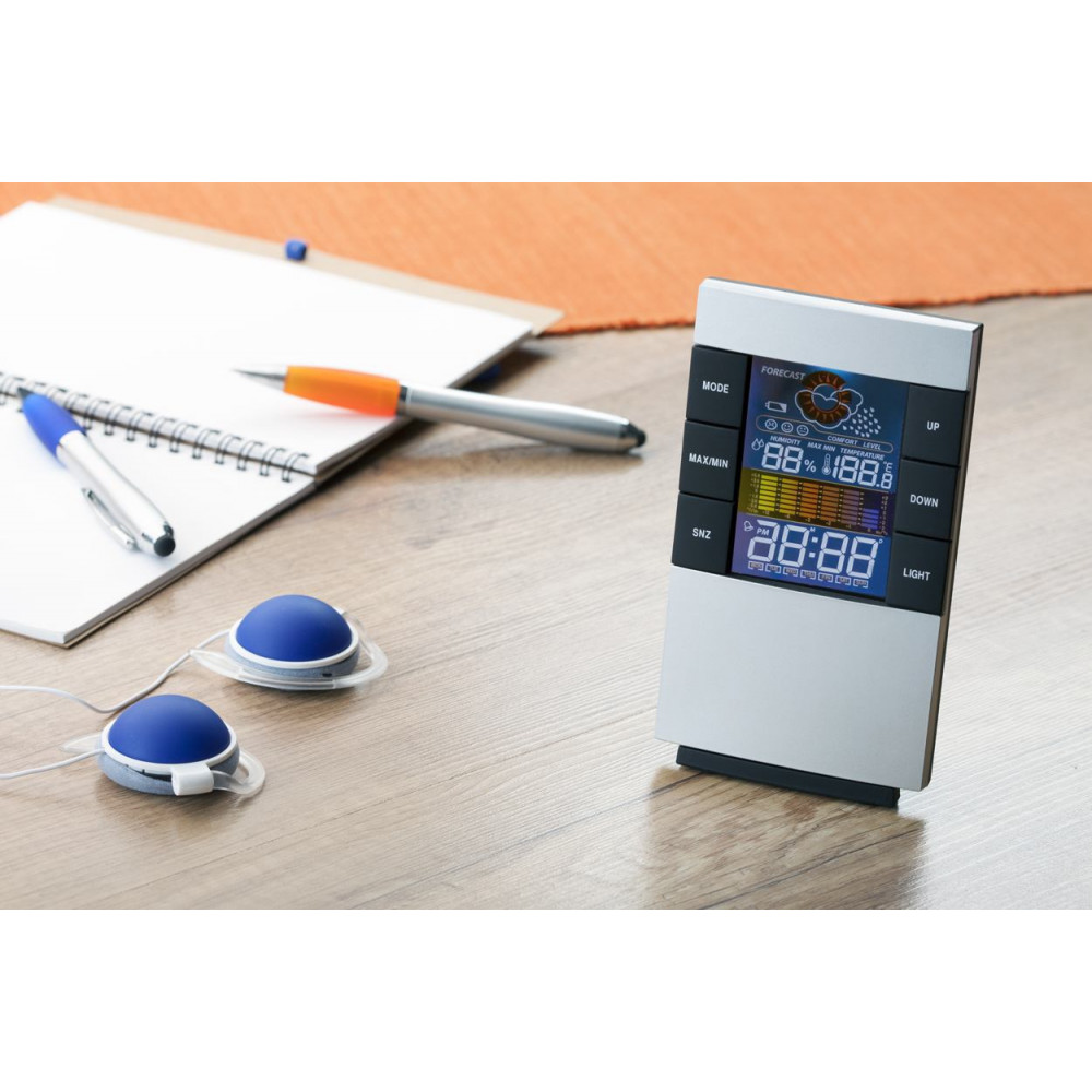 Cyfrowy zegar i stacja pogodowa z kolorowym wyświetlaczem. Funkcje: alarm, pomiar wilgoci i temperatury.