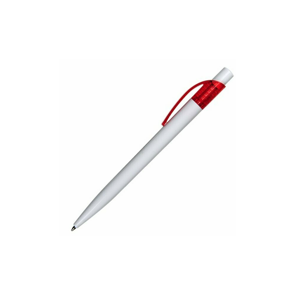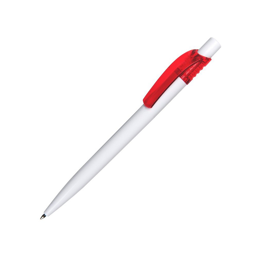 Plastikowy długopis promocyjny. Wyposażony w niebieski wkład.