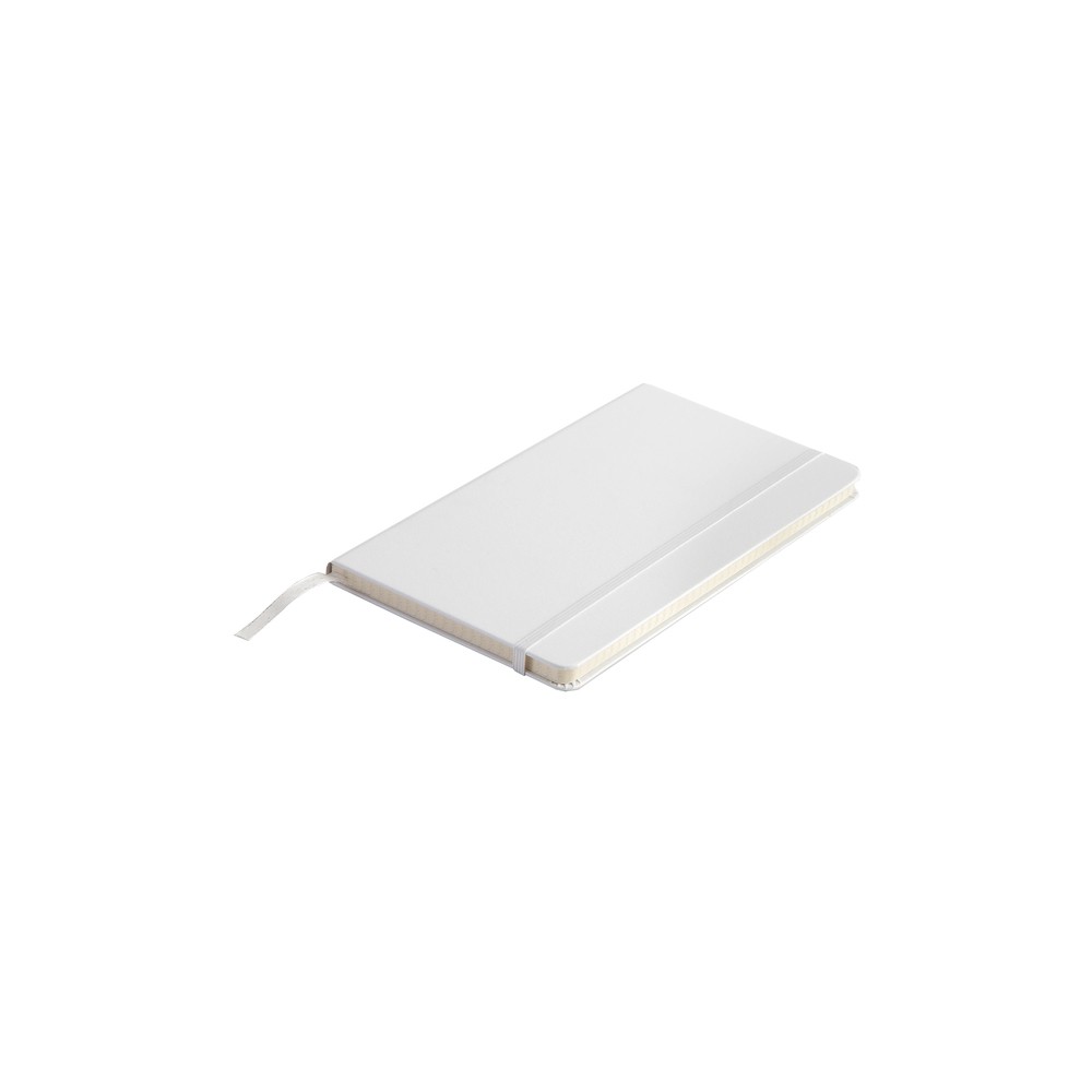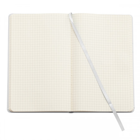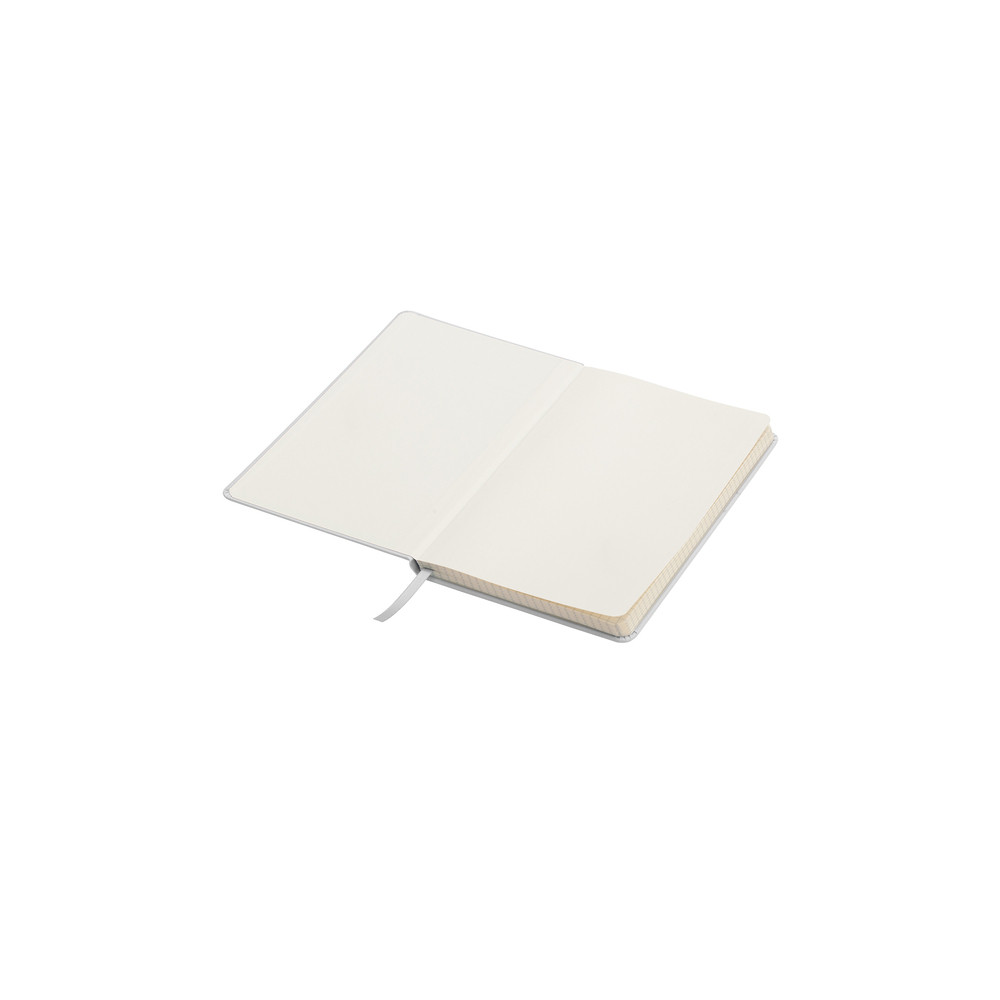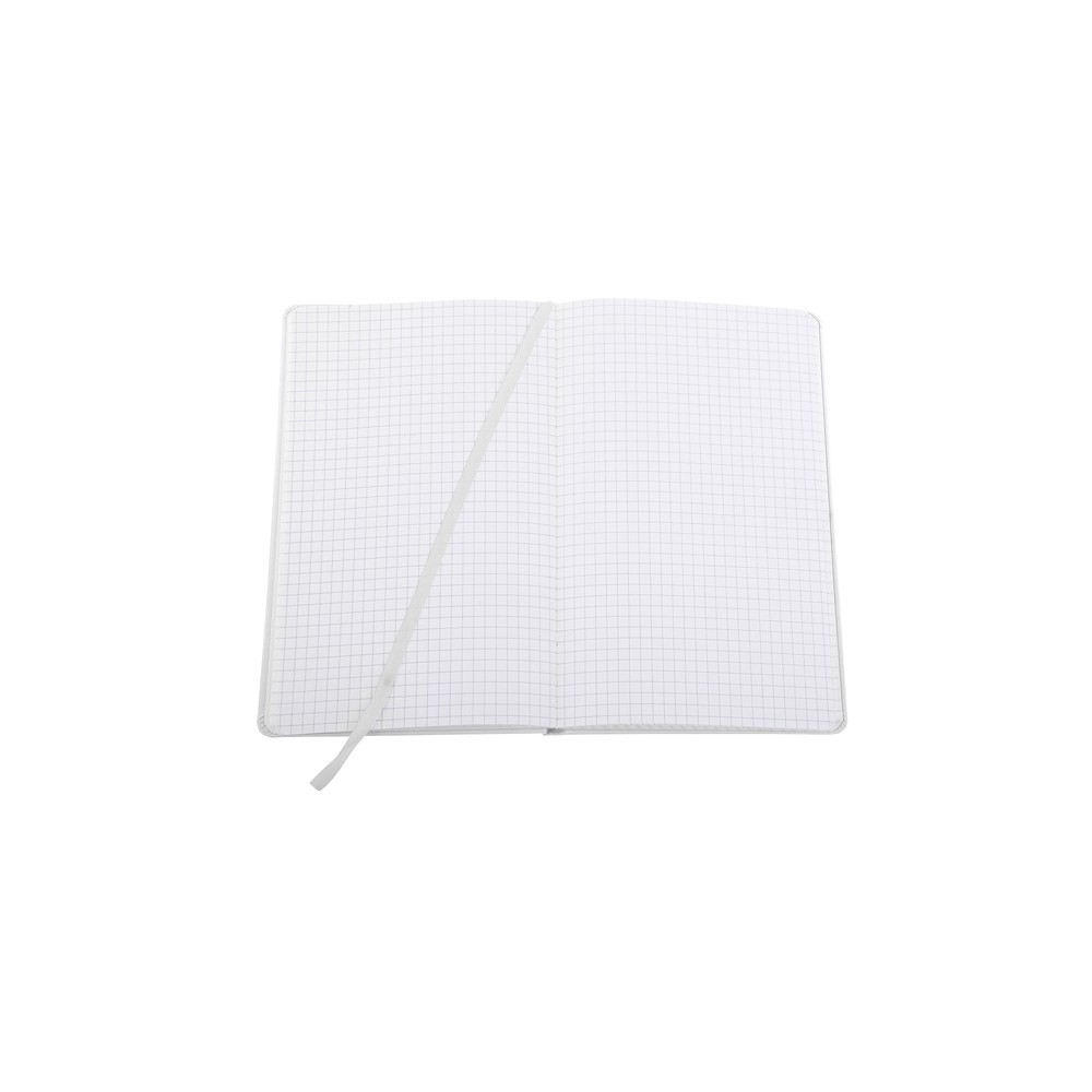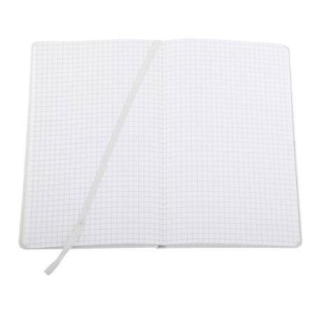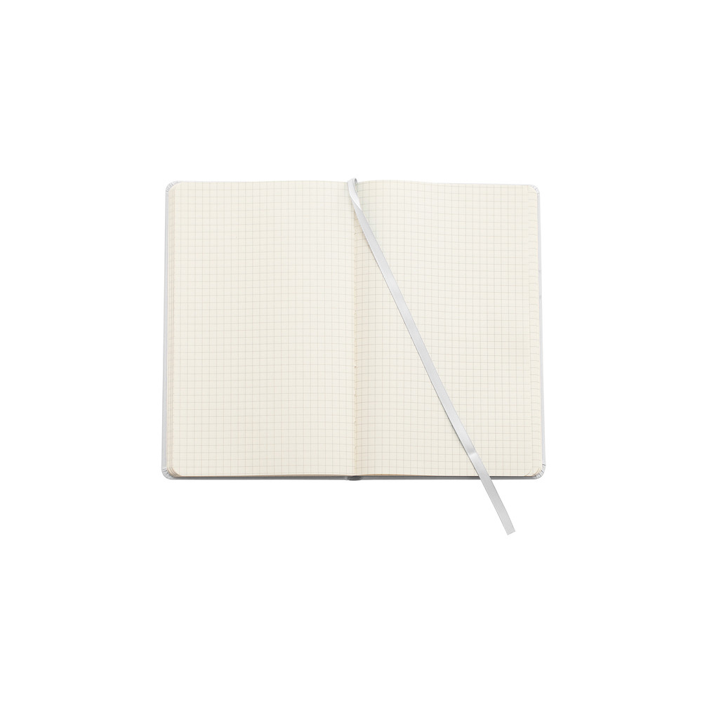 Notatnik w twardej oprawie z elastyczną gumką chroniącą wnętrze. Papier kremowy chamois w kratkę o gramaturze 70 g/m2 o wymiarze 13 x 21 cm, 80 kartek, tasiemka do zaznaczanie ostatniej zapisanej strony.