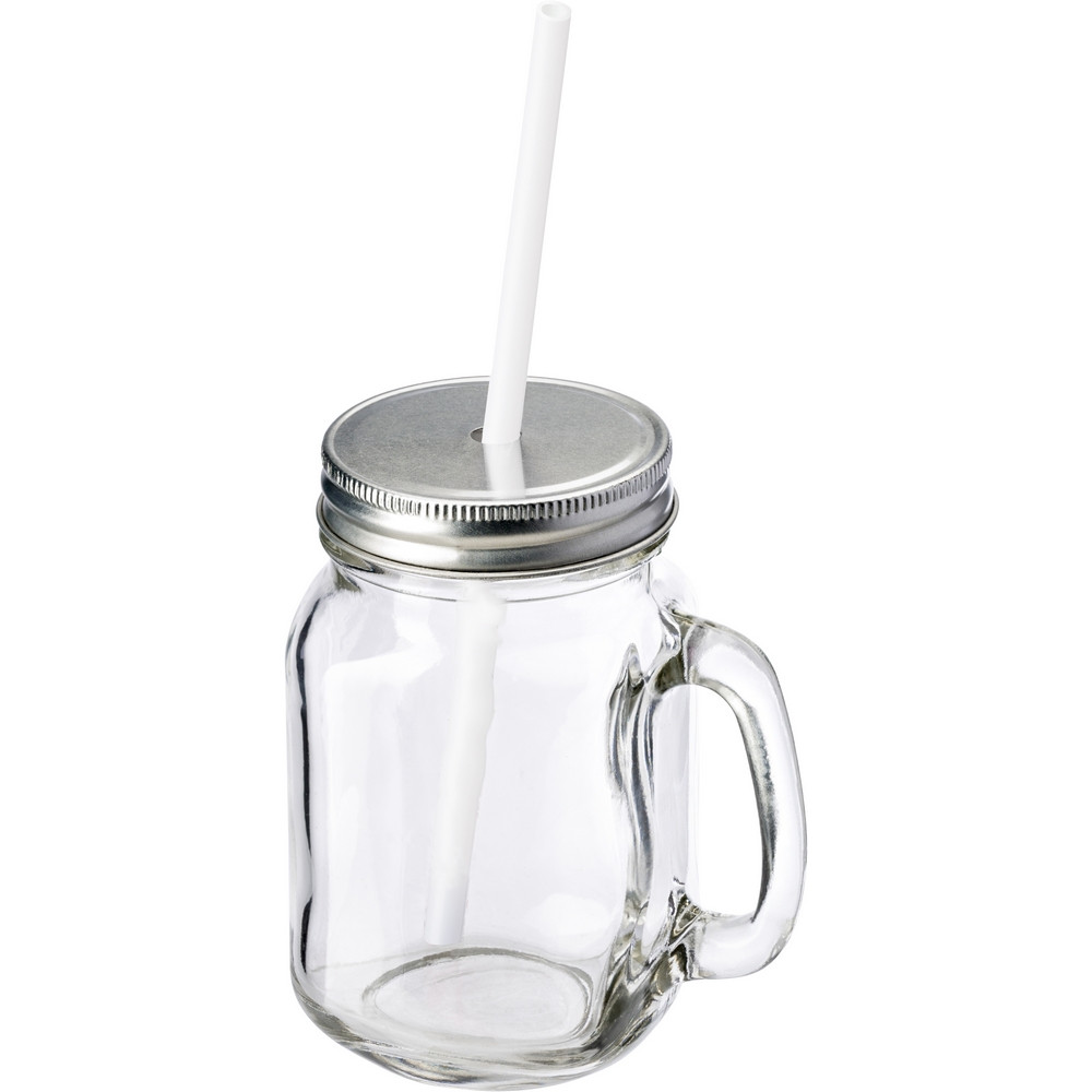 Słoik do picia 480 ml, z rączką i srebrnym wieczkiem z otworem na słomkę