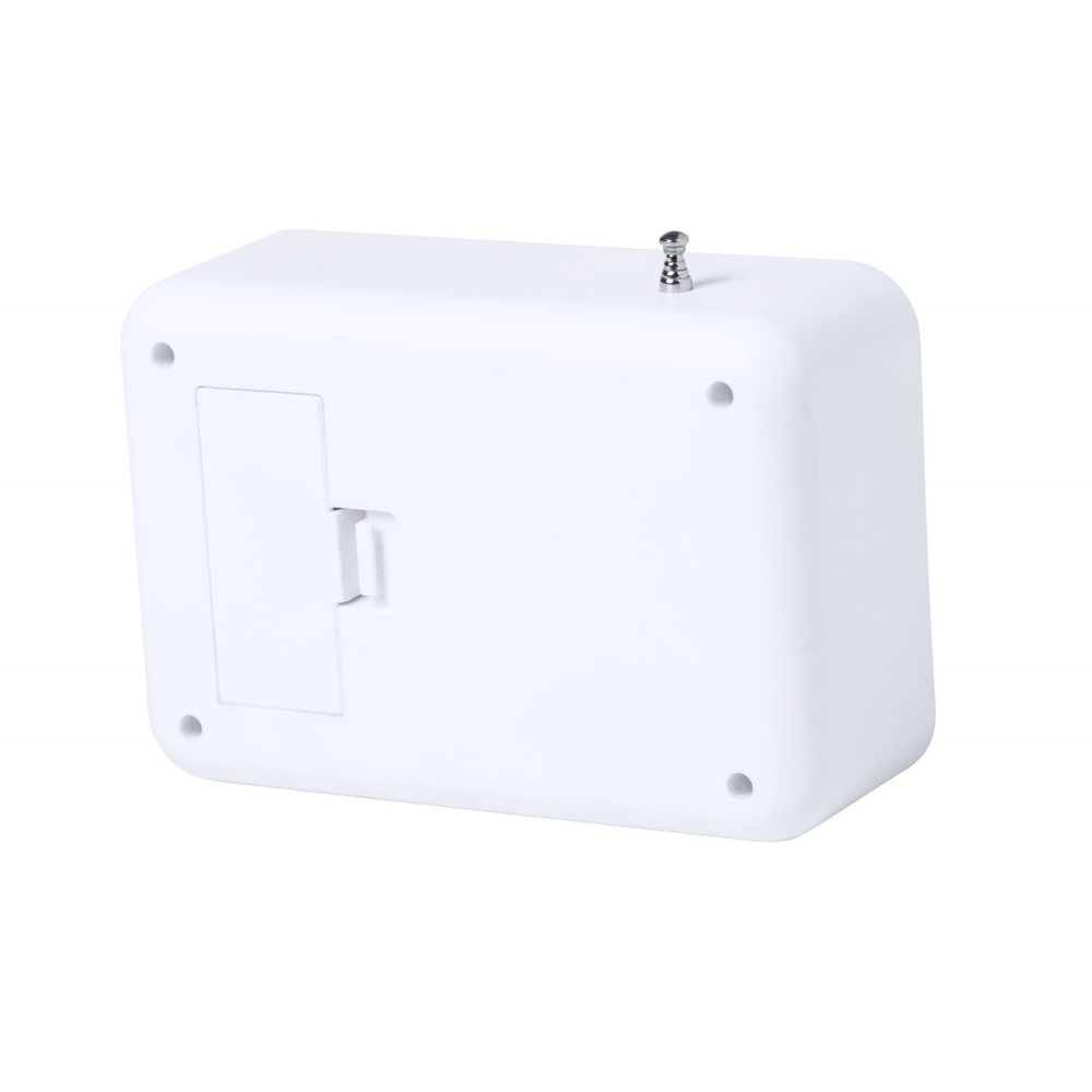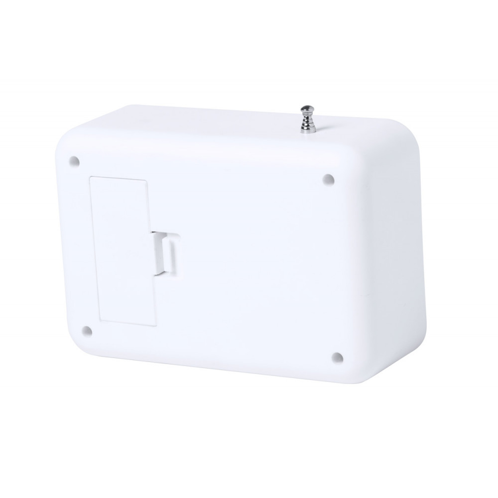 Bambusowy zegarek biurkowy z radiem FM, termometrem, kalendarzem i budzikiem. Zasilany 2 bateriami AAA. Brak baterii w zestawie.