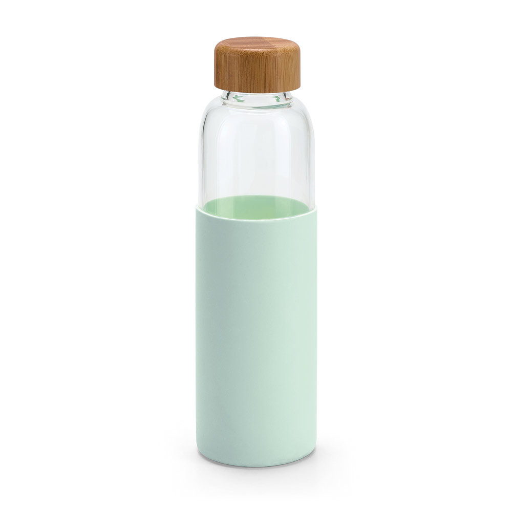 Butelka ze szkła borokrzemowego. Bambusowe wieczko i silikonowy pokrowiec ochronny. Pojemność do 600 ml. Dostarczana w pudełku kartonowym.