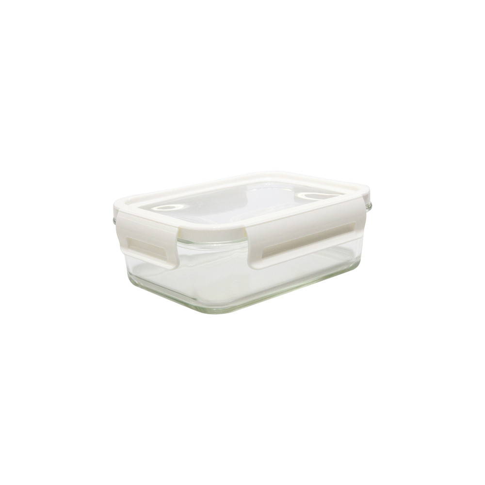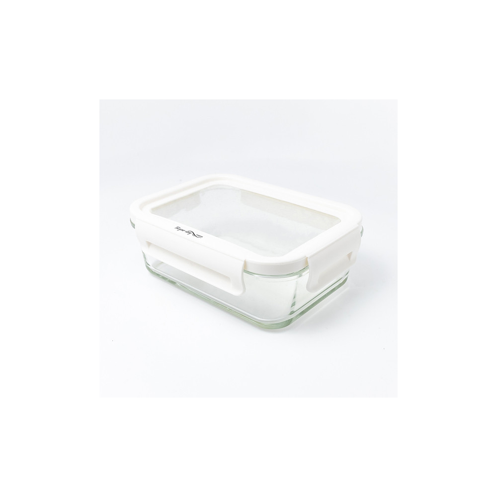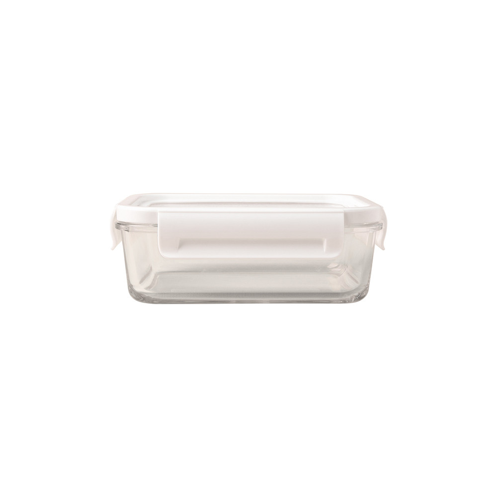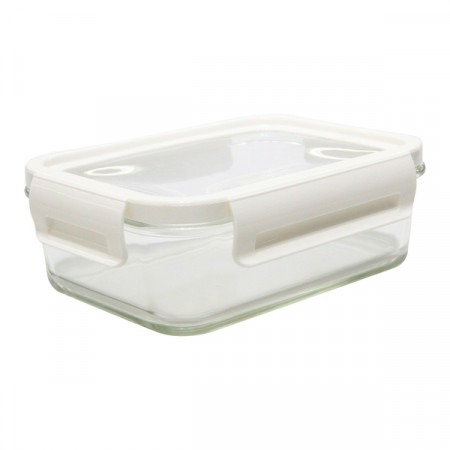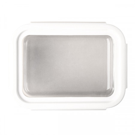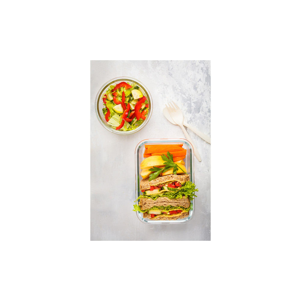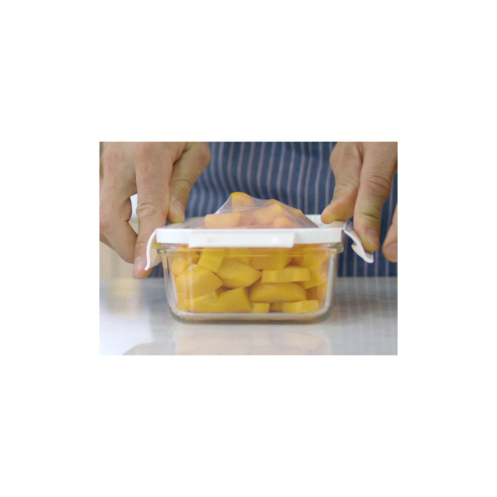 Szklany pojemnik na lunch (900 ml) z hermetyczną pokrywką z silikonu. Elastyczna pokrywka pozwala dopasować się do zawartości pojemnika zwiększając jego objętość.