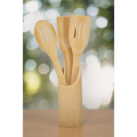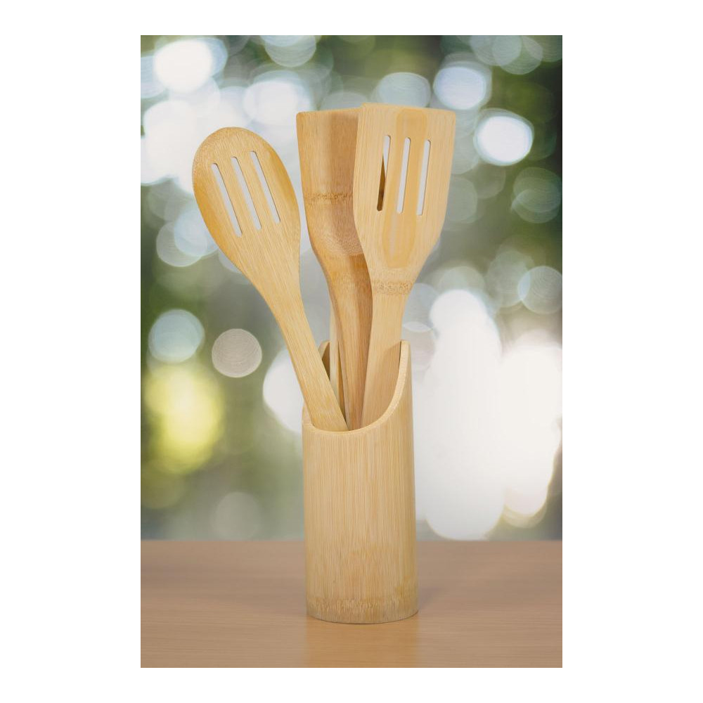Zestaw przyborów kuchennych COOKING TIME. Składa się z 5 bambusowych elementów: łyżki, szpatułek i pojemnika.