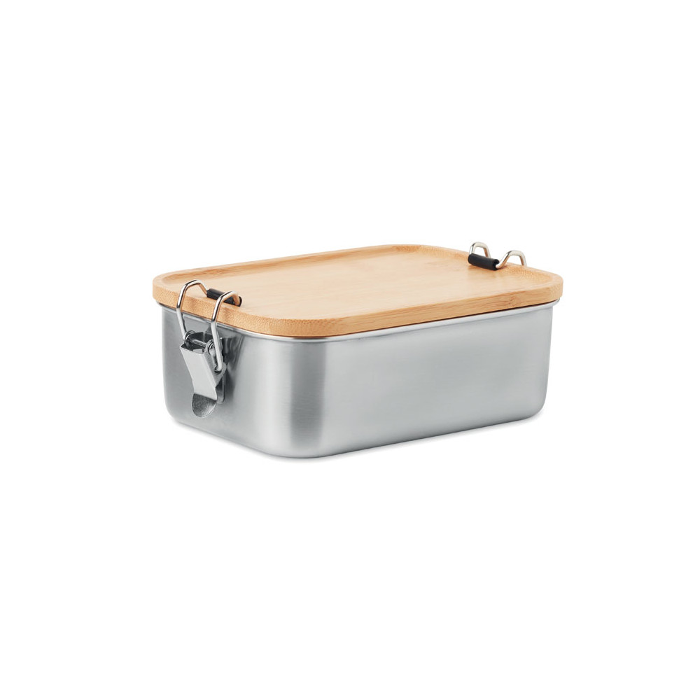 Lunchbox ze stali nierdzewnej z bocznymi klamrami zamykającymi i bambusową pokrywką. Pojemność: 750 ml.