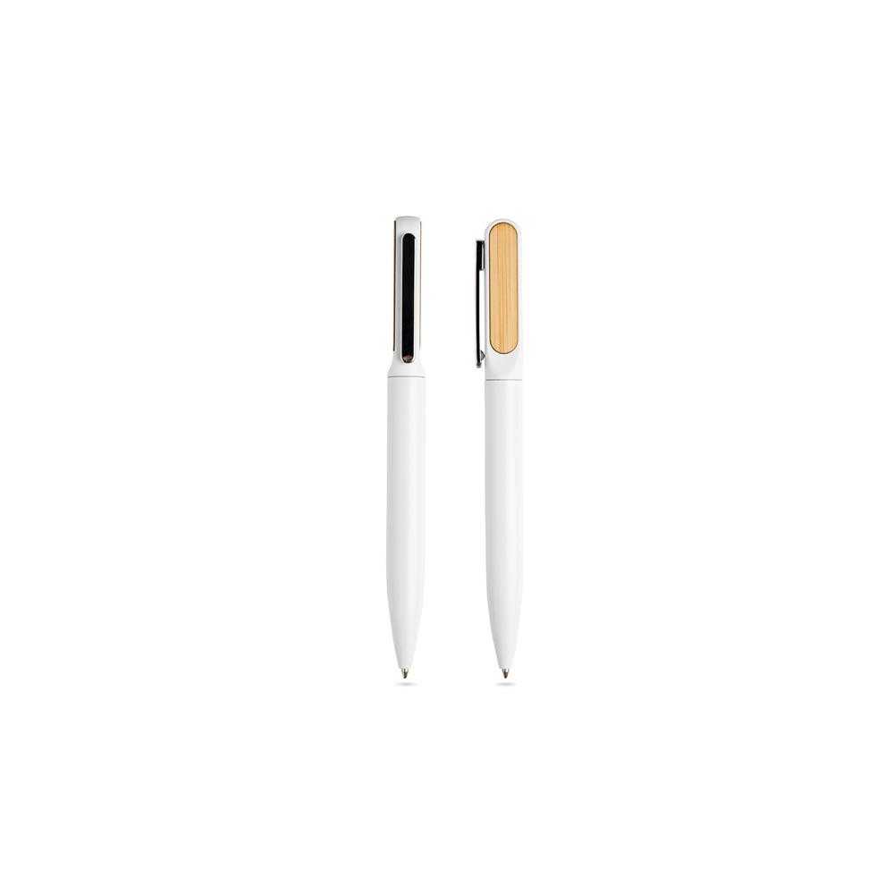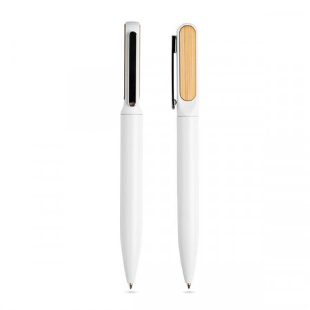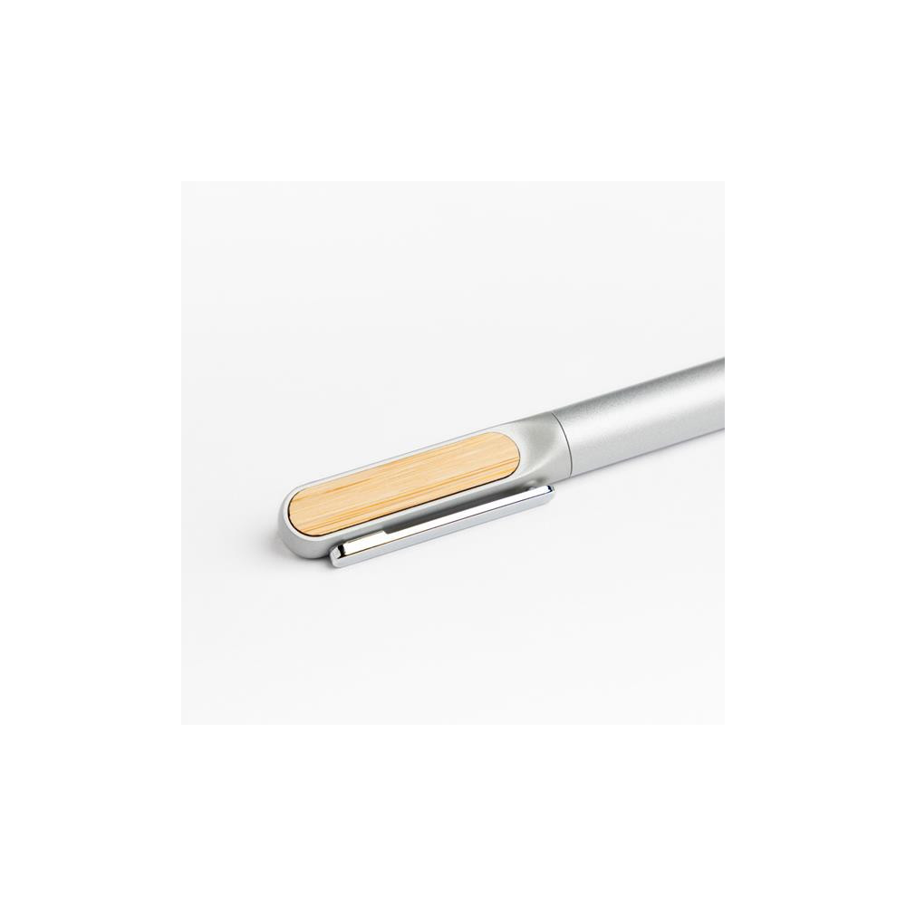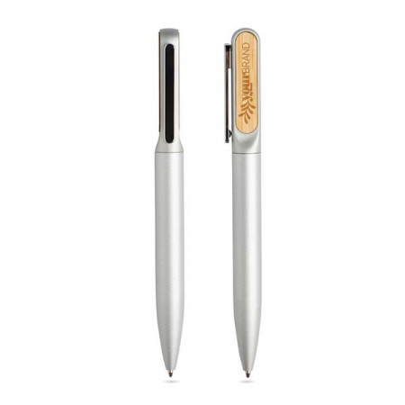 Elegancki metalowy długopis z dwoma bambusowymi elementami, które idealnie nadają się do znakowania laserowego.