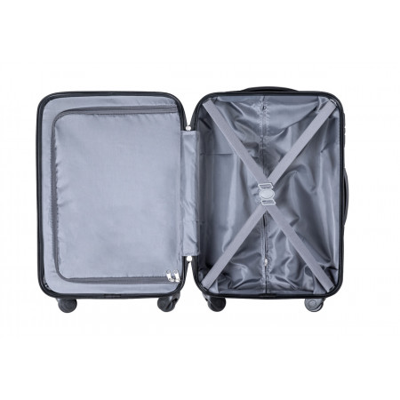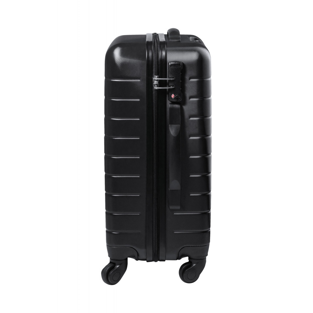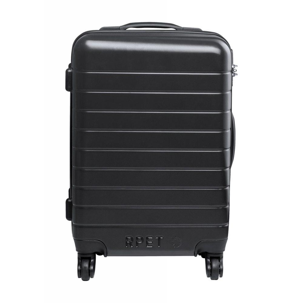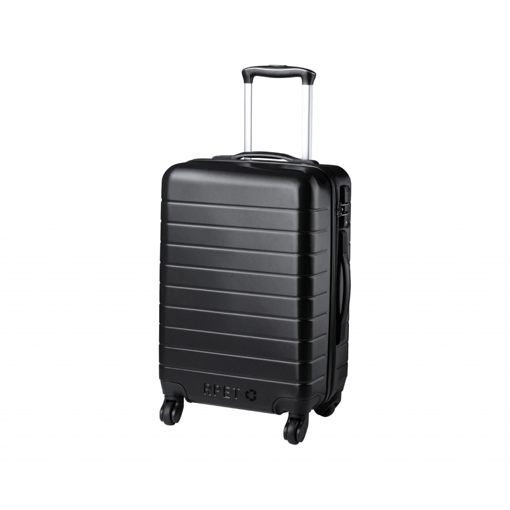 Plastikowa walizka na kółkach RPET z 4 podwójnymi kółkami, teleskopową rączką i zamkiem szyfrowym TSA. Z wewnętrzną podszewką RPET i elastycznymi paskami mocującymi. Z charakterystyczną metką RPET.