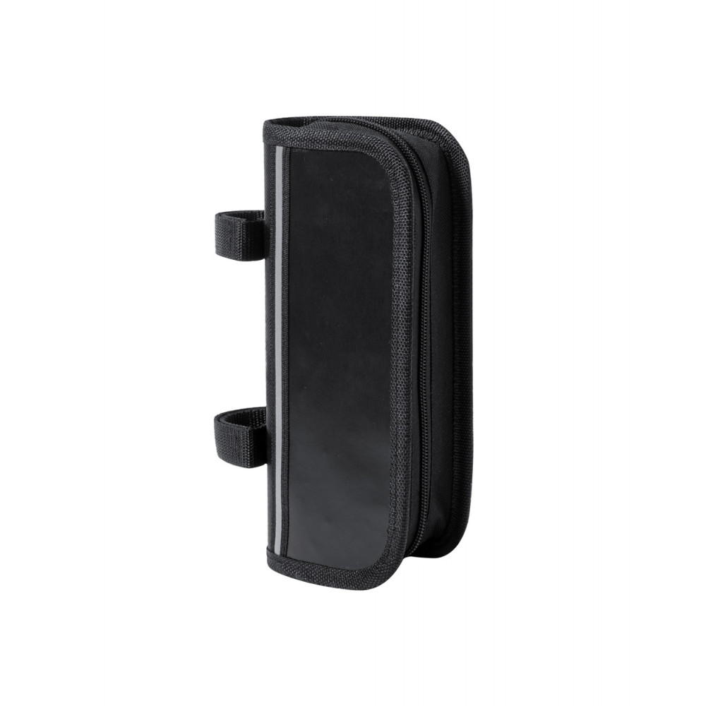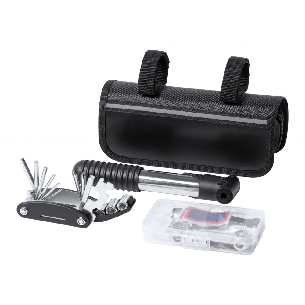 Zestaw naprawczy do roweru w praktycznej torbie na ramę rowerową z Poliester 600D. Zawiera: 15-funkcyjny multi tool, klucz imbusowy, mini pompkę i zestaw naprawczy do opon (2 łyżki do opon, tarkę i 6 łatek).