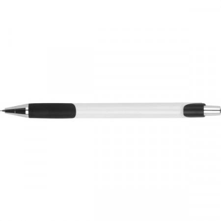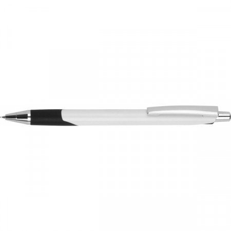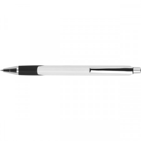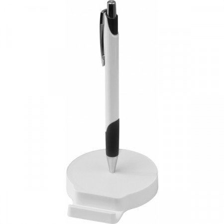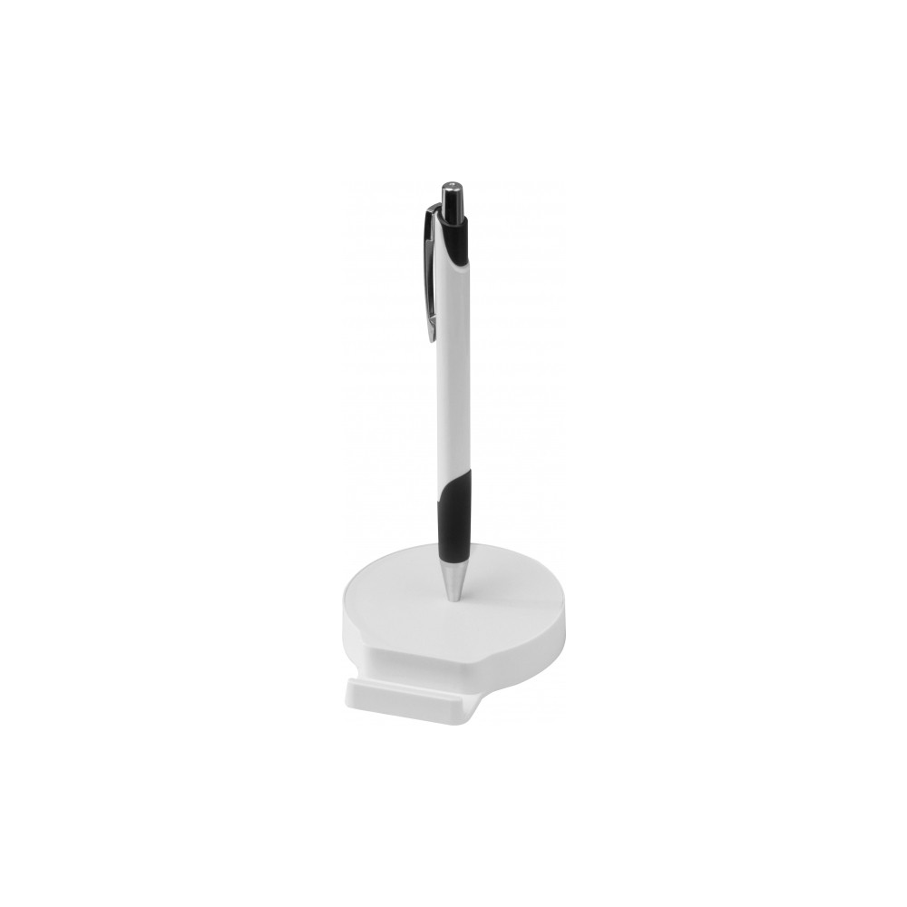 Plastikowy stojak na telefon z antypoślizgową podstawą i metalowym długopisem piszącym na niebiesko.