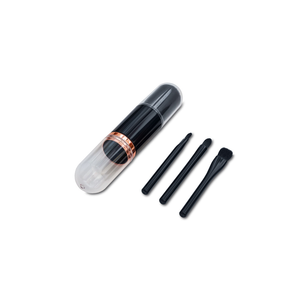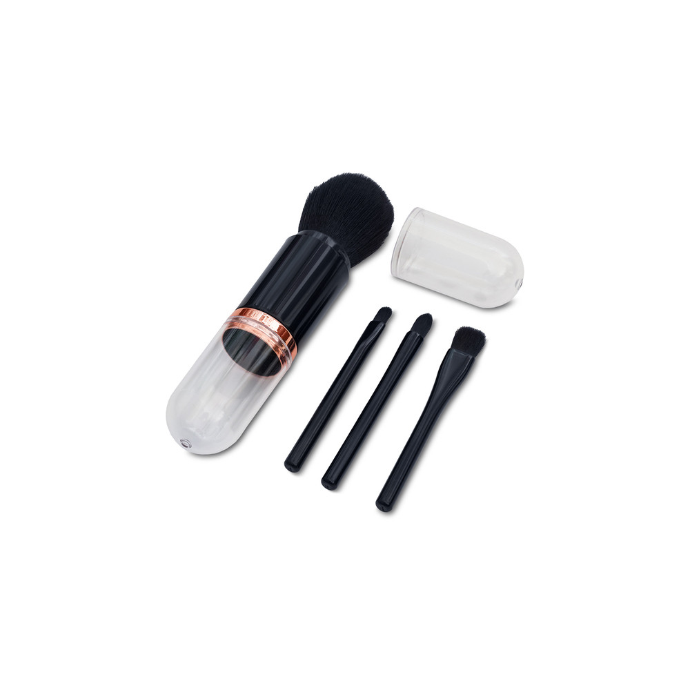 Podróżny zestaw pędzli do makijażu z 4 w 1. Zestaw składa się z wysuwanego pędzla do nakładania pudru oraz 3 pędzelków do makijażu oczu w praktycznym etui.