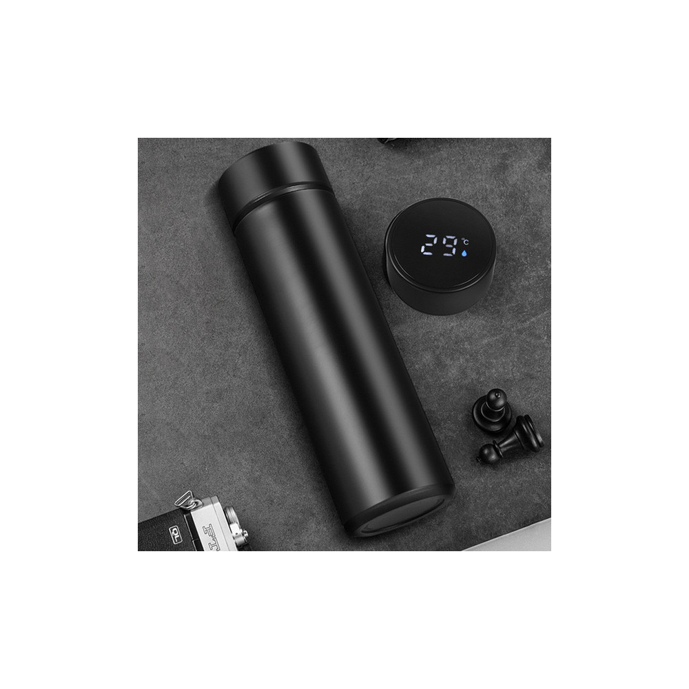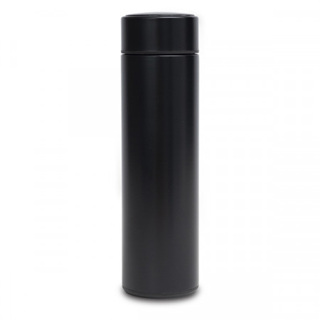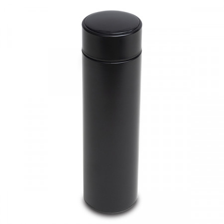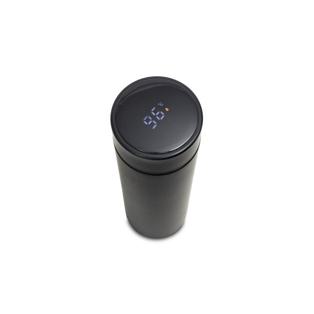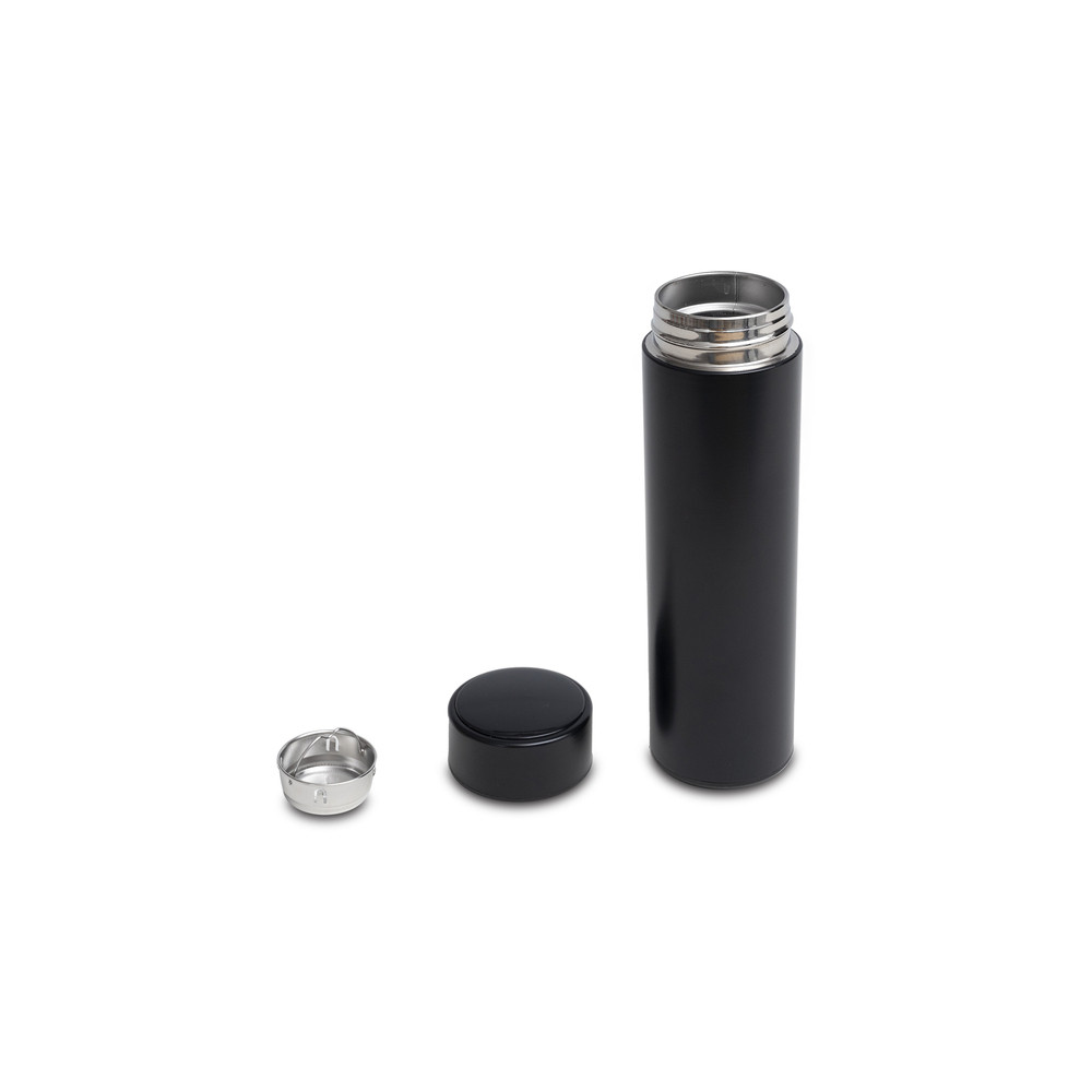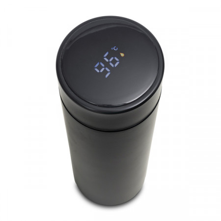 Termos próżniowy o pojemności 420 ml z dwiema metalowymi ściankami, świetnie utrzymujący ciepło, szczelny. Wnętrze wykonane ze stali nierdzewnej 18/8 o podwyższonej jakości. Posiada wbudowany w nakrętkę termometr z wymienna baterią CR2032, który przy dotknięciu wyświetlacza pokazuje temperaturę napoju . W zestawie stalowe siteczko do zaparzania herbaty. Matowe wykończenie powierzchni. Utrzymuje temperaturę powyżej 40°C przez 15 godzin.