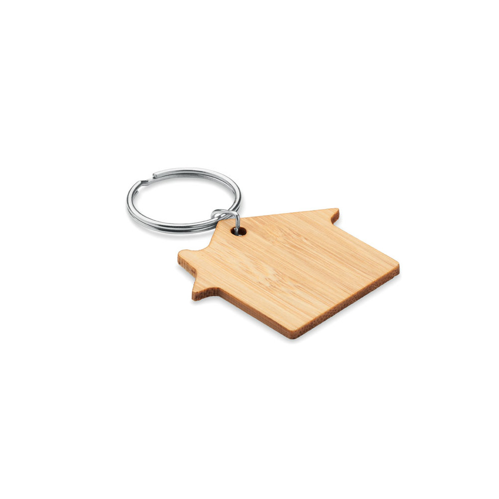 Bambusowy brelok w kształcie domu. Bambus jest produktem naturalnym, dlatego mogą wystąpić nieznaczne różnice w kolorze, wzorze i rozmiarze.