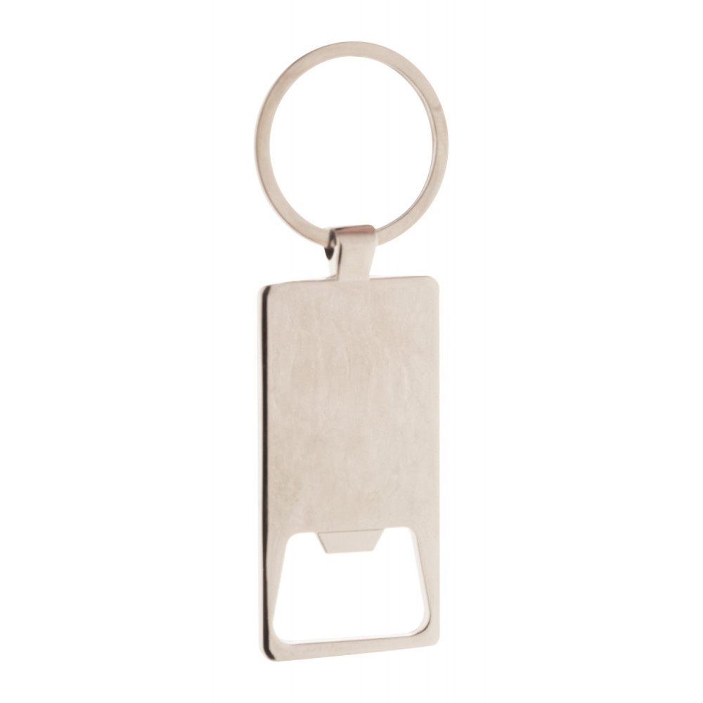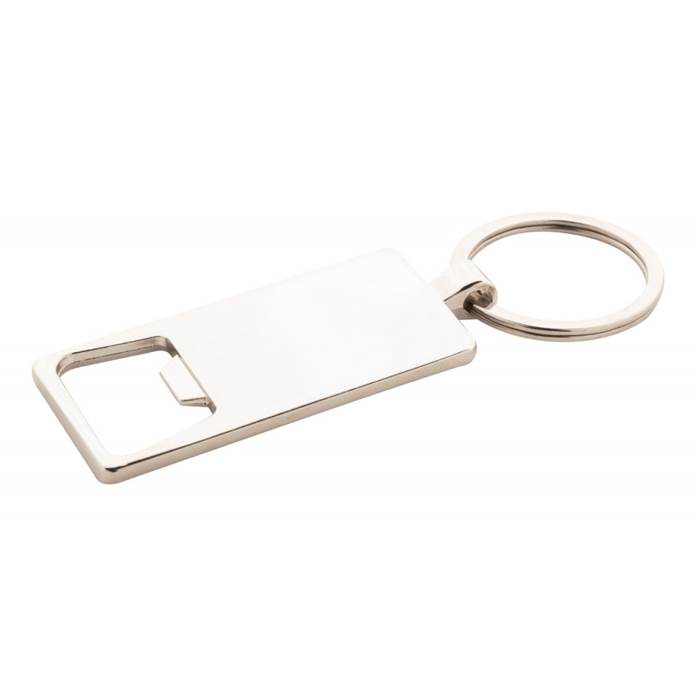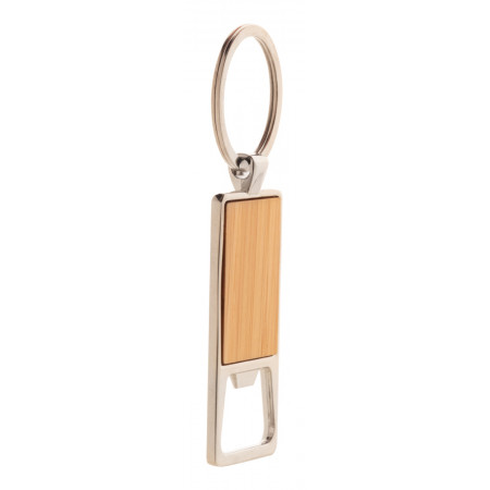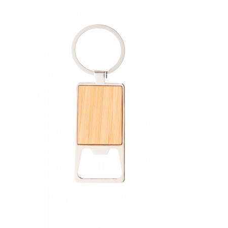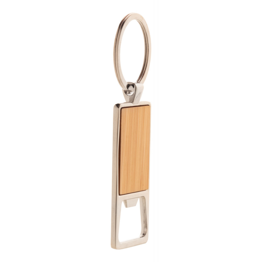 Metalowy brelok z bambusową wkładką i otwieraczem do butelek.