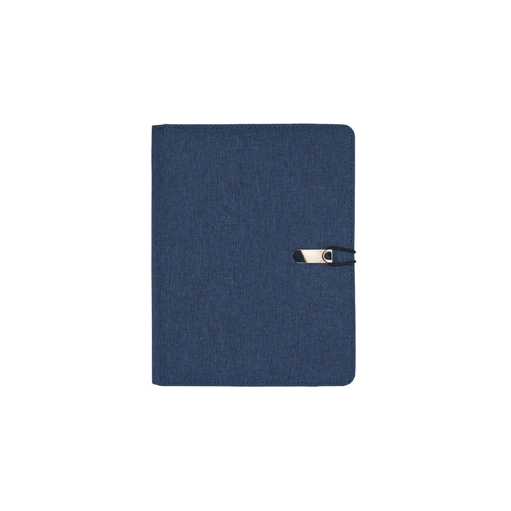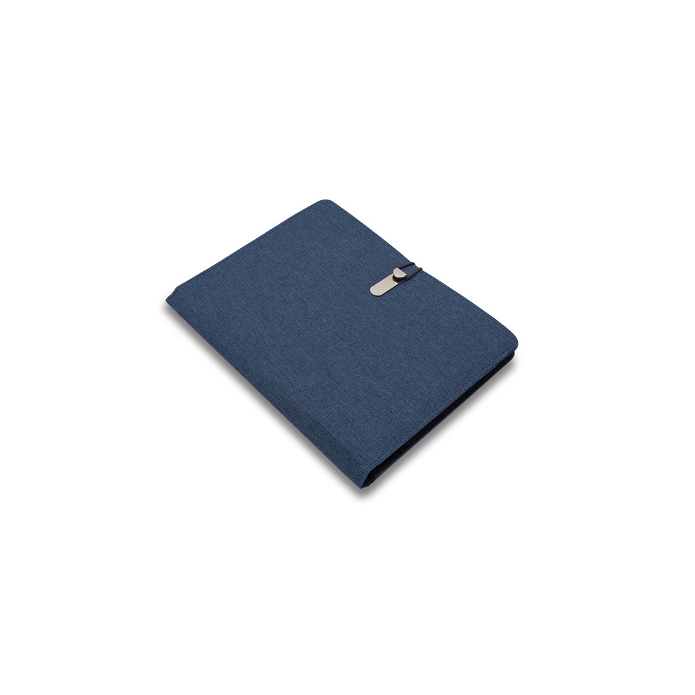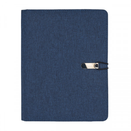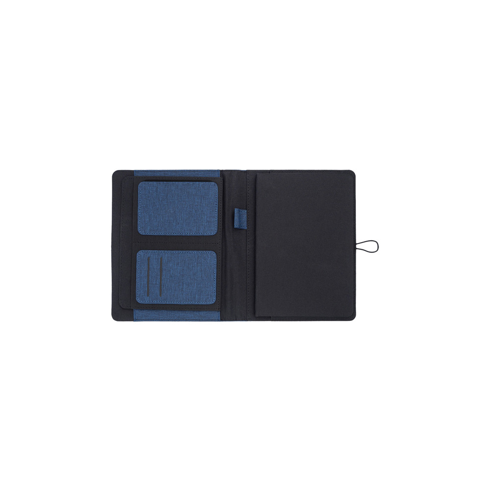 Organizer z wymiennym notesem A5 (64 kartek w kratkę, 70g/m2). Twarda okładka wykonana z tkaniny RPET. Organizer zawiera jedną dużą przegrodę, 3 mniejsze kieszonki, kieszonkę na wizytówki oraz uchwyt na długopis. Teczka zapinana jest na gumkę zaczepianą o metalowy haczyk.