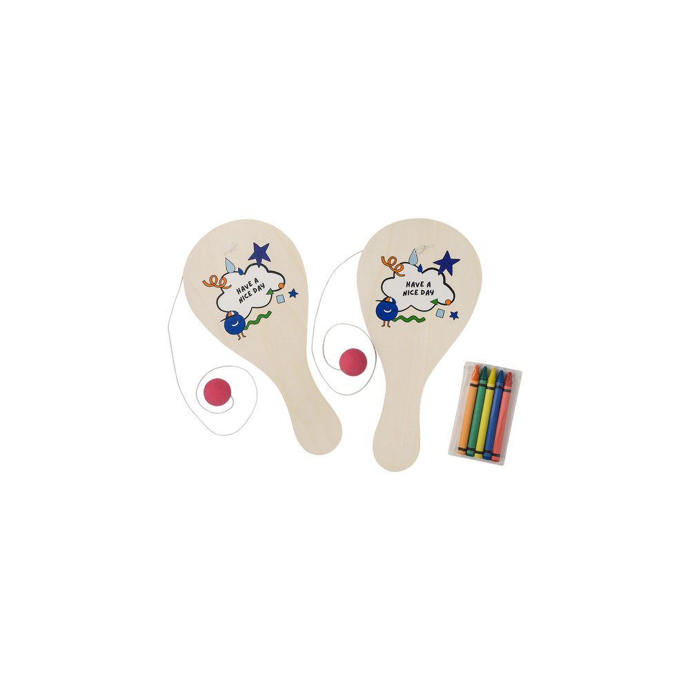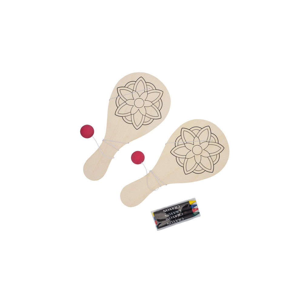 Zestaw paletek do zabawy z piłeczką na gumce. Zawiera zestaw kredek do kolorowania paletek.
